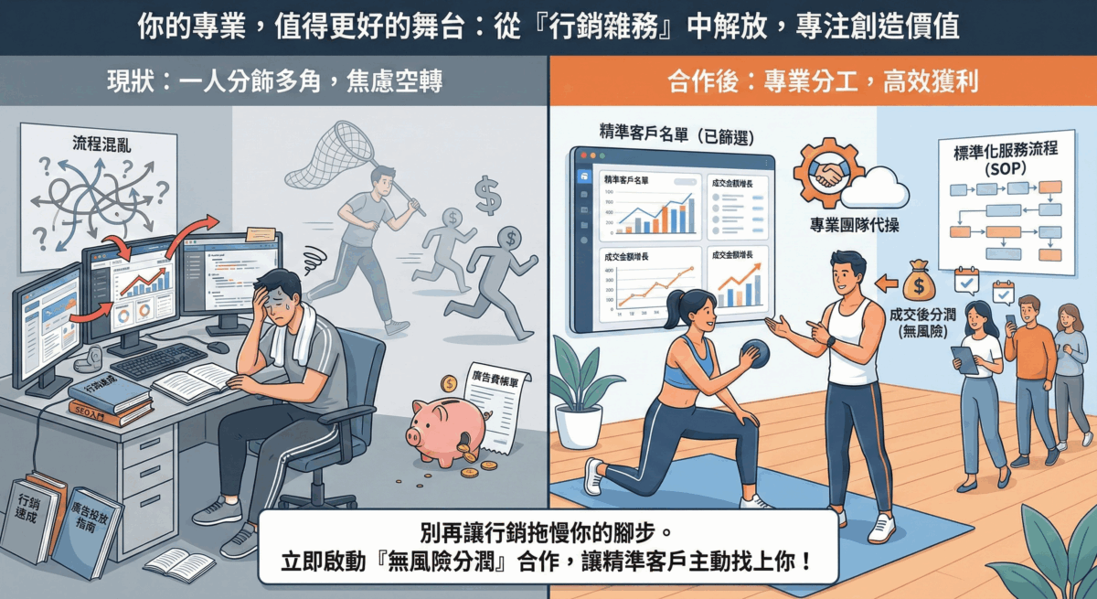 簡單說:我負責操盤行銷與銷售,你只需要專注做好你最擅長的服務與交付。讓專業的人,做專業的事。